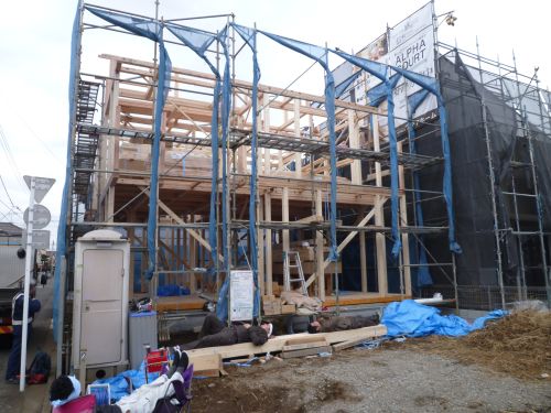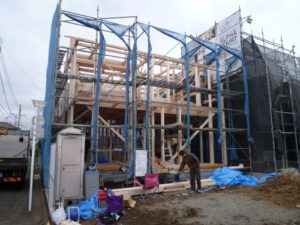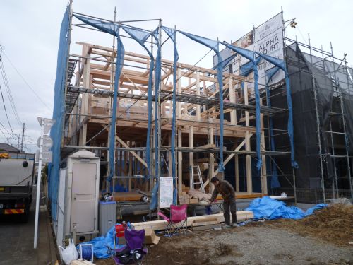本日、東大和市で上棟致しました。早朝から大工さん方が頑張っています・・・