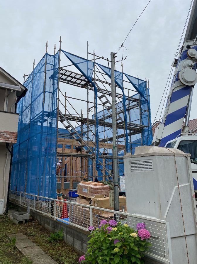 本日、東大和市で上棟しております。 早朝から大工さん・現場監督が頑張っております。