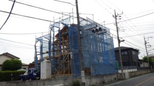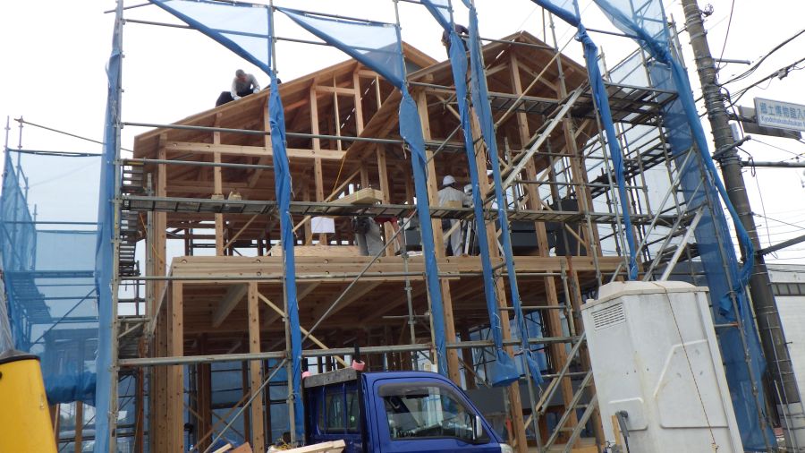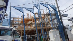 本日、東大和市で上棟しております。お天気も良く上棟日和です ! 早朝から大工さん・現場監督が頑張っております。