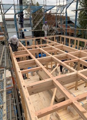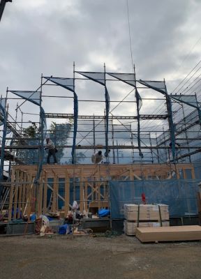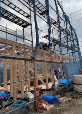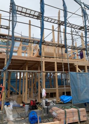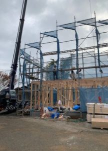 本日、清瀬市で上棟しております。早朝から大工さん・建て方屋さん・現場監督が頑張っています!