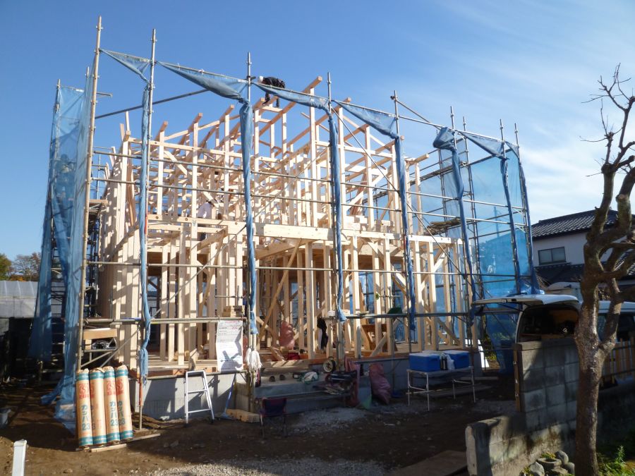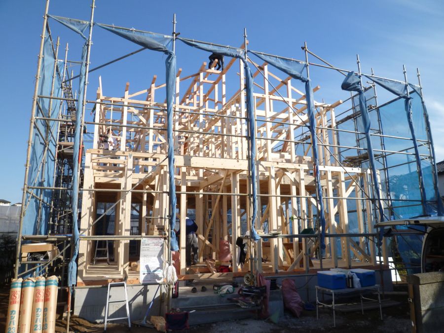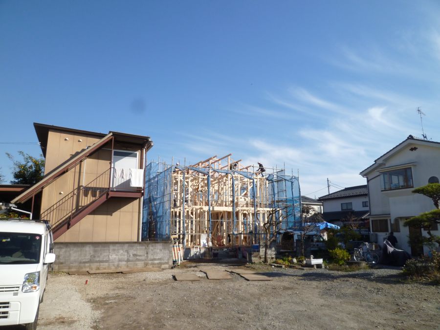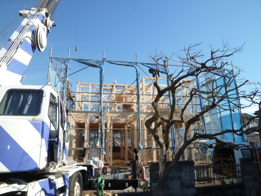 おはようございます。本日、羽村市で上棟させて頂いております。お天気も良く早朝から大工さん方・現場監督が頑張っています。
