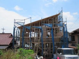 この梅雨時ですので毎回雨が心配ですが若い大工さん方は雨にも負けず頑張ってくれます。M様邸はZEH(ゼロエネルギー住宅)の高性能の建物です。