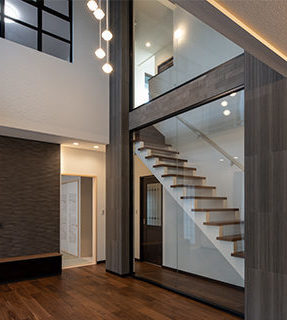 もう1ヶ所は東大和市向原で私共のモデルハウスを見て頂きます。全館空調の高断熱仕様・固定階段付き小屋裏収納・屋上のある家です。リビングには大きな吹き抜けガラス張りの階段で来られたお客様は感動されます !