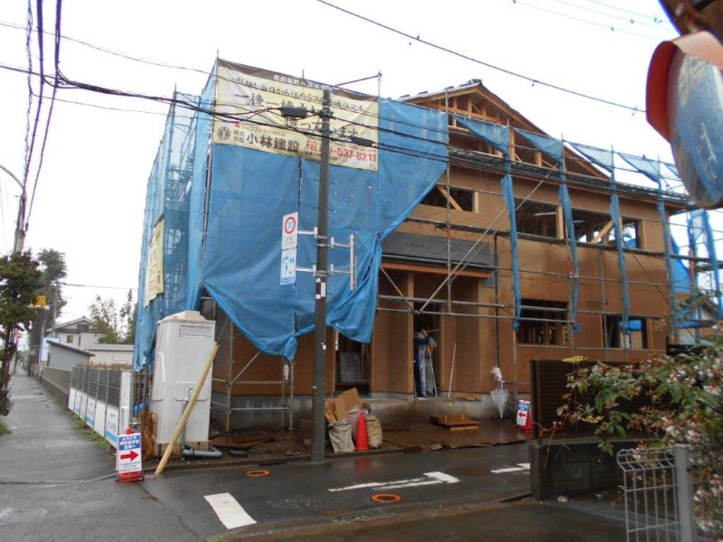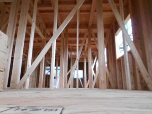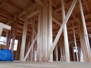上棟して間もないので先週より骨組み状態が見れます。総ヒノキ・4寸角・制震装置付き・耐震等級3相当の構造を見て頂けます。