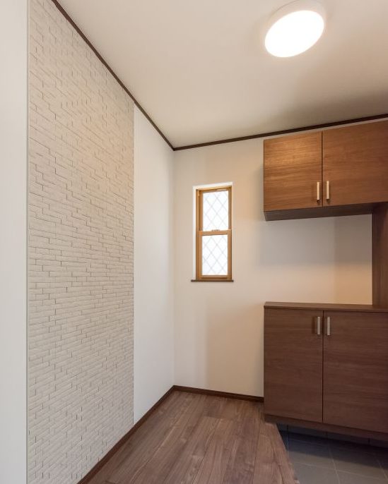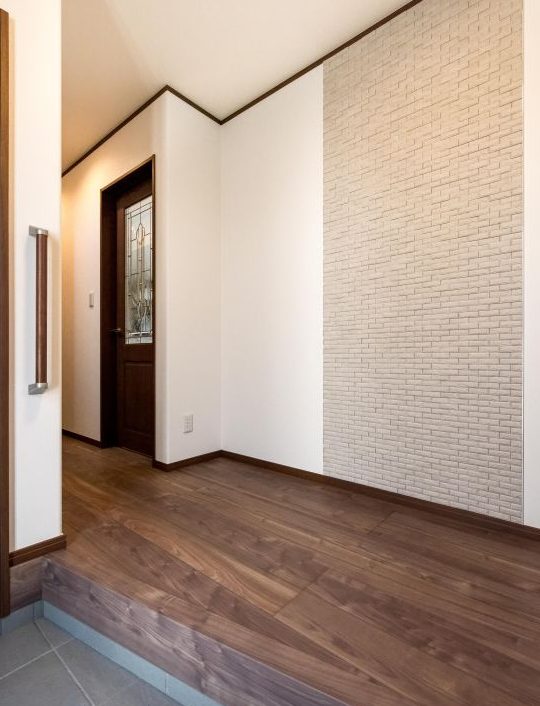 室内玄関の壁にエコカラットを貼り高級感を演出。こだわり住宅です。