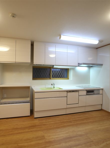 高低差のある土地に駐車場もつくりたいというご希望を叶えるため、敷地高低差は基礎を一部深基礎にして対応しています。リビングとダイニングの間には引き戸をつくり、状況に合わせて一部屋としても別部屋として使えるようにしています