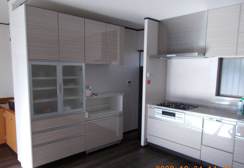 システムキッチンに同じ面材の食器棚を付け収納たっぷりです。
